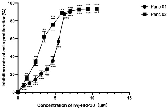 The effect of rAj-HRP30 on Panc01 and Panc02 cell proliferation was determined using the CCK-8 method (n = 3). The control group was treated with a blank medium, and the experimental group was treated with rAj-HRP30. Significant difference between the blank group and each experimental group (** p < 0.01, and *** p < 0.001).