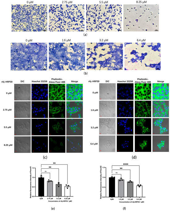 (a) Effect of rAj-HRP30 on the morphology of Panc01 cells (OLYMPUS digital imaging microscope, Tokyo, Japan, 200×; scale: 2 μm). (b) Effect of rAj-HRP30 on the morphology of Panc02 cells (OLYMPUS digital imaging microscope, Tokyo, Japan, 200×; scale: 2 μm). (c) The effects of rAj-HRP30 on the cytoskeleton and nucleus of Panc01 were determined using an FITC-ghost cyclic peptide assay (Zeiss laser scanning confocal microscope, Oberkochen, Baden-Wurttemberg, Germany, 200×; scale: 2 μm). (d) The effects of rAj-HRP30 on the cytoskeleton and nucleus of Panc02 were determined using an FITC-ghost cyclic peptide assay (Zeiss laser scanning confocal microscope, Oberkochen, Baden-Wurttemberg, Germany,200×; scale: 2 μm). (e) Effect of rAj-HRP30 on changes in relative fluorescence intensity of the Panc01 cytoskeleton (n = 3). The control group was treated with a blank medium, and the experimental group was treated with rAj-HRP30. ns indicates no statistical significance; ** indicates significant difference between the blank group and each experimental group (** p < 0.01). (f) Effect of rAj-HRP30 on changes in relative fluorescence intensity of the Panc02 cytoskeleton (n = 3). The control group was treated with a blank medium, and the experimental group was treated with rAj-HRP30. ns indicates no statistical significance; **, **** indicates significant difference between the blank group and each experimental group (** p < 0.01 and **** p < 0.0001).