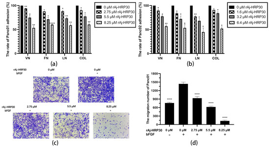 In this study, collagen (COL), vitronectin (VN), laminin (LN), and fibronectin (FN) were selected as the primary ECM components to investigate the effects of varying concentrations of rAj-HRP30 on the adhesion of Panc01 and Panc02 cells. The experimental results (Figure 6a,b) demonstrate that as the concentration of rAj-HRP30 increased, the adhesion rate of cells to these four ECM proteins gradually decreased. These findings indicate that rAj-HRP30 significantly inhibits the adhesion of Panc01 and Panc02 cells to ECM proteins, with a concentration-dependent effect.