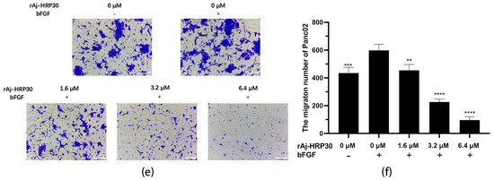 (a) The effect of rAj-HRP30 on the adhesion of Panc01 cells was determined (n = 3); significant differences between the experimental group treated with rAj-HRP30 and the control group treated with empty medium are indicated by * p < 0.05, ** p < 0.01, and **** p < 0.0001. (b) The effect of rAj-HRP30 on the adhesion of Panc02 cells was determined (n = 3); significant differences between the experimental group treated with rAj-HRP30 and the control group treated with empty medium are indicated by * p < 0.05, ** p < 0.01. (c) The degree of Panc01 cell migration under different administered concentrations (OLYMPUS digital imaging microscope, scale: 200 μm). (d) The amount of Panc01 cell migration under different administered concentrations (n = 3). The experimental group was treated with bFGF- or rAj-HRP30, and the control group was treated with bFGF+ without medication. Significant differences are expressed by **** p < 0.0001. (e) The degree of Panc02 cell migration under different administered concentrations (OLYMPUS digital imaging microscope, scale: 200 μm). (f) The amount of Panc02 cell migration under different administered concentrations (n = 3). The experimental group was treated with bFGF- or rAj-HRP30, and the control group was treated with bFGF+ without medication. Significant differences are expressed by ** p < 0.01, *** p < 0.001, and **** p < 0.0001.