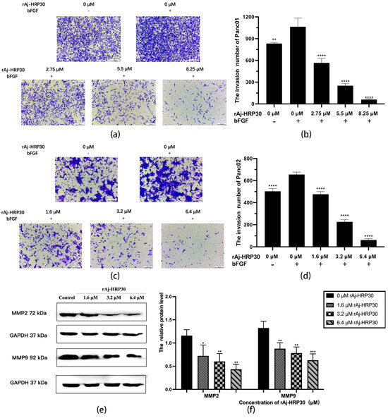 To simulate the in vivo three-dimensional environment, this study utilized Transwell chambers with polycarbonate membranes coated with the artificial ECM matrix Matrigel. The results (Figure 7a–d) reveal that, compared with the control group without bFGF, the cell invasion rate was significantly higher in the group with bFGF in the lower chamber, indicating that the chemokine bFGF effectively promotes the invasion of Panc01 and Panc02 cells. Using the bFGF-treated non-drug group as a control, the results further demonstrate that, with increasing concentrations of rAj-HRP30, the number of invading cells gradually decreased, thereby providing compelling evidence that rAj-HRP30 effectively inhibits the bFGF-induced invasion of Panc01 and Panc02 cells, and this inhibitory effect is concentration-dependent.