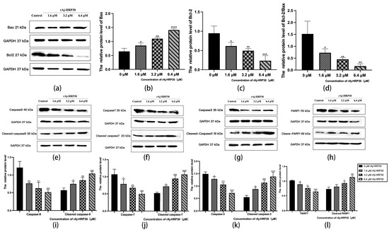 Bcl-2 proteins primarily function by modulating apoptotic signaling pathways, maintaining the redox state of cells through a series of mechanisms that inhibit oxidative reactions, thereby preventing apoptosis [25]. Within this family, Bax can interact with Bcl-2 to form homodimers that promote apoptosis or heterodimers with other proteins that inhibit apoptotic processes [26]. As such, the relative expression levels of pro-apoptotic and anti-apoptotic proteins serve as key indicators of whether apoptosis will occur, with the Bax/Bcl-2 ratio functioning as a “molecular switch” for cell death [27]. In the present study, the impact of rAj-HRP30 on the expression levels of Bax and Bcl-2 in Panc02 cells was assessed. The experimental results (Figure 9a–d) demonstrate that, as the concentration of rAj-HRP30 increased, the expression of Bax and Bcl-2 exhibited inverse trends; the relative expression of Bcl-2 progressively decreased, while that of Bax increased. Consequently, the Bax/Bcl-2 ratio also declined, a trend that was both concentration-dependent and statistically significant. These findings suggest that rAj-HRP30 effectively downregulates the Bax/Bcl-2 ratio, thereby facilitating the activation of apoptotic signaling pathways mediated by the Bcl-2 family.