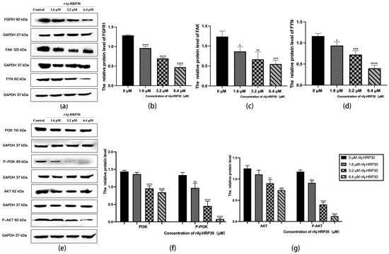 (a) Bar graph illustrating the Western blot results for FGRF1, FYN, and FAK expression in Panc02 cells treated with rAj-HRP30. (b) Statistical analysis of the relative optical densities of FGRF1 (target proteins) normalized to GAPDH levels (n = 3); the control group was treated with a blank medium, and the experimental groups were treated with rAj-HRP30. Significant differences between the blank group and the experimental groups are expressed by **** p < 0.0001. (c) Statistical analysis of the relative optical densities of FAK (target proteins) normalized to GAPDH levels (n = 3); the control group was treated with a blank medium, and the experimental groups were treated with rAj-HRP30. Significant differences between the blank group and the experimental groups are expressed by * p < 0.05, ** p < 0.01, and *** p < 0.001. (d) Statistical analysis of the relative optical densities of FYN (target proteins) normalized to GAPDH levels (n = 3); the control group was treated with a blank medium, and the experimental groups were treated with rAj-HRP30. Significant differences between the blank group and the experimental groups are expressed by * p < 0.05, *** p < 0.001, and **** p < 0.0001. (e) Bar graph illustrating the Western blot results for PI3K, p-PI3K, AKT, and p-AKT expression in Panc02 cells treated with rAj-HRP30. (f) Statistical analysis of the relative optical densities of PI3K and p-PI3K (target proteins) normalized to GAPDH levels (n = 3); the control group was treated with a blank medium, and the experimental groups were treated with rAj-HRP30. Significant differences between the blank group and the experimental groups are expressed by ** p < 0.01 and **** p < 0.0001. (g) Statistical analysis of the relative optical densities of AKT and p-AKT (target proteins) normalized to GAPDH levels (n = 3); the control group was treated with a blank medium, and the experimental groups were treated with rAj-HRP30. Significant differences between the blank group and the experimental groups are expressed by ** p < 0.01, *** p < 0.001, and **** p < 0.0001.