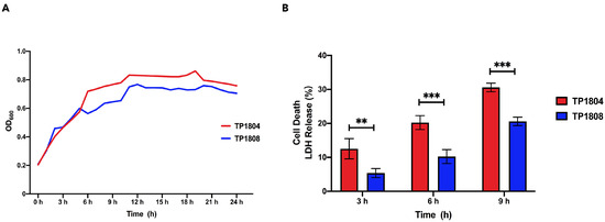 Growth curves (A) and cytotoxicity (B). (A) Bacterial growth curves of TP1804 and TP1808 for 24 h. (B) Cytotoxicity of TP1804 and TP 1808 for 3 h, 6 h, and 9 h. The mean ± SEM of data is shown from three independent repeats (** p < 0.01, *** p < 0.001).