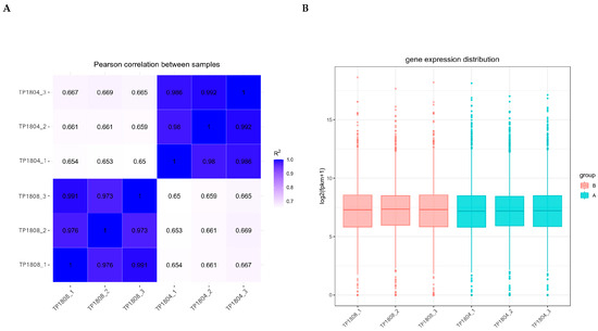 Gene expression correlation (A) and gene expression box plot (B). (A) The horizontal and vertical axes represent the squared correlation coefficients of each sample. (B) The horizontal axis represents the sample name, and the vertical axis represents log2 (FPKM + 1).