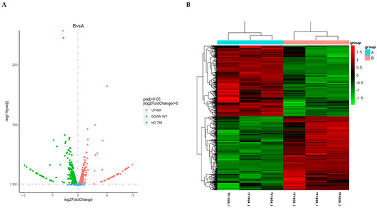 Volcano map of differential gene analysis (A) and differential gene clustering heatmap (B). (A) The horizontal axis presents the log2 (fold change) and the vertical axis represents −log10 (paj) or −log10 (p-value); upregulated genes are represented by red dots, while downregulated genes are represented by green dots; (B) the horizontal axis represents the sample name and the vertical axis represents the normalized value of the differential gene FPKM.