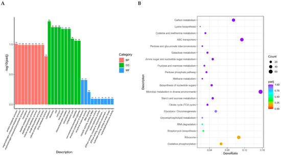 GO function enrichment analysis (A) and KEGG pathway enrichment analysis (B). (A) The horizontal axis represents GO Term and the vertical axis represents the significance level of GO Term enrichment, denoted by −log10 (padj). Different colors indicate different functional classifications. The 30 most significant terms from the GO enrichment analysis results were selected, and a bar chart for display was drawn. If there were less than 30 terms, we drew a bar chart for all terms, classified by biological processes, cellular components, and molecular functions, as well as differentially expressed genes. (B) The horizontal axis represents the ratio of the number of differentially expressed genes annotated onto the KEGG pathway to the total number of differentially expressed genes, while the vertical axis represents the KEGG pathway.