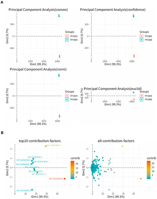 Sample grouping PCA analysis (A) and the principal component diagram of the top ten contributions (B).