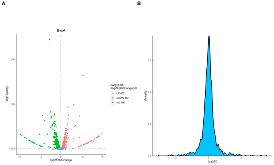 Differential protein volcano diagram (A) and differential multiple density plot (B). (A) The horizontal axis represents the expression fold changes in proteins in different experimental groups/samples, and the vertical axis represents the statistical significance of changes in protein expression levels. (B) The X-axis represents log2 (FC) and the Y-axis represents the fold density of proteins between groups.