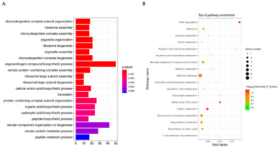 In organisms, different genes coordinate with each other to perform their biological functions, and significant enrichment through pathways can determine the most important biochemical metabolic pathways and signal transduction pathways involved in candidate proteins. The KEGG enrichment scatter plot of candidate proteins is a graphical display of KEGG enrichment analysis results (Figure 7B). The top 10 most significant terms are RNA degradation, citrate cycle, carbon metabolism, metabolic pathways, biosynthesis of secondary metabolites, microbial metabolism in diverse environments, porphyrin and chlorophyll metabolism, glycerolipid metabolism, biosynthesis of antibiotics, and ribosome.
