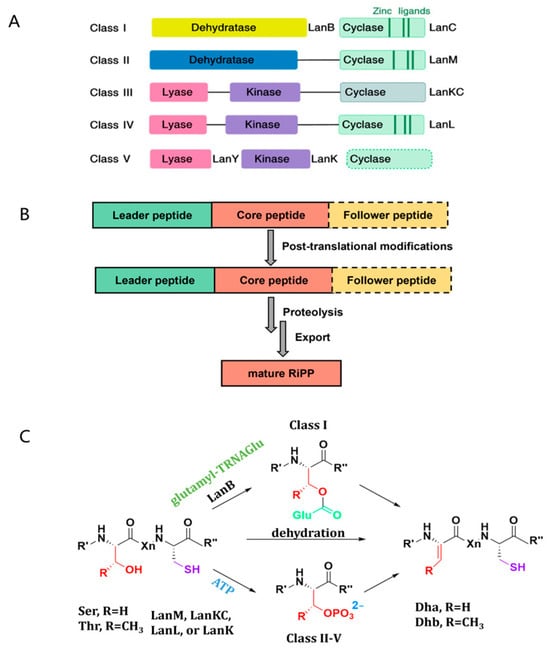 (A) General biosynthetic logic for RiPP, (B) five classes of lanthipeptide and its general biosynthetic genes, and (C) two dehydration patterns in the formation of Dha and Dhb amino acids. Dha: dehydroalanine; Dhb: dehydrobutyrine.