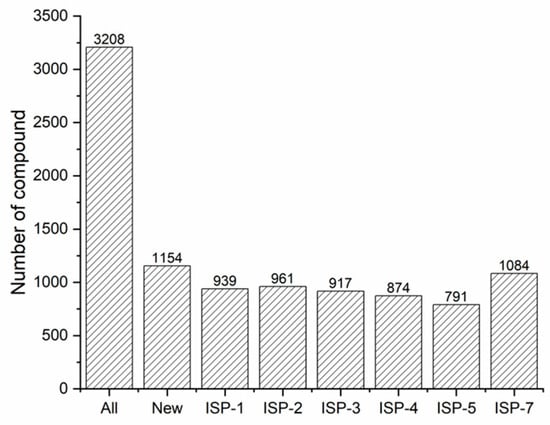 Secondary metabolite investigation of S. thermolilacinus SPC6. All: compounds from all six media together. New: the new compounds from all six media together. ISP-1, 2, 3, 4, 5, and 7: new compounds for the corresponding medium.