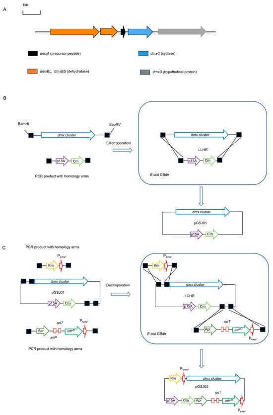(A) The organizational structure of BCG dmx. (B) Linear plus linear Red/ET recombination (LLHR) in E. coli GBdir to construct pGSJ01 containing the BGC dmx. (C) Linear plus circular recombination (LCHR) in E. coli GBred to modify pGSJ01 to pGSJ02 containing conjugation, integration elements, and strong promoter. Black square: homology arm; p15A: origin in E. coli; Cm: chloramphenicol resistance; Km: kanamycin resistance; Apr: apramycin resistance; OriT: conjugation elements; intφ31: integration element; attP: integration sit; Perme* and Pkaso*: promotor in Streptomyces.