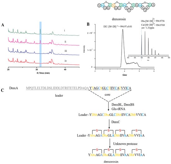 Production of dmxorosin: (A) HPLC analysis (i) pGSJ02 (a derivative of pSET152) containing BGC dmx expressed in S. albus, (ii) pGSJ02 (a derivative of pSET152) containing BGC dmx expressed in S. albus (parallel test), (iii) gene dmxA cloned in pSET152 and expressed in S. albus, and (iv) pSET152 in S. albus; (B) LC-HRMS analysis and structure of dmxorosin; (C) proposal of the biosynthetic pathway of dmxorosin. The leader peptide is shown in gray, and the core peptide is shown in black, except for Ser, Thr, and their dehydration residue, which are marked in orange, and the Cys and Ala residues are marked in blue. The sulfur atom from Cys is marked in red. The proteolytic cleavage sites are underlined. Abu: 2-aminobutyric acid.