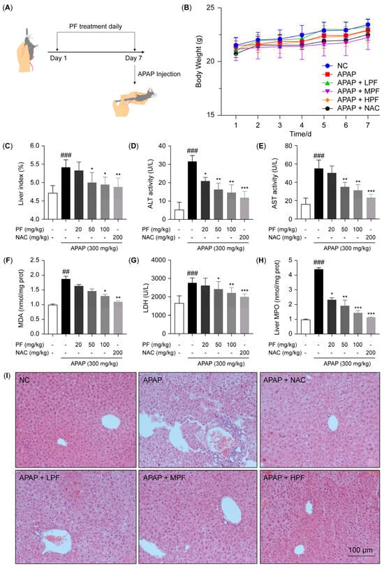 PF attenuates AILI in mice. (A) Schematic diagram of drug administration to animals (n = 6); (B) body weights of mice during administration; (C) liver index measurements; (D–G) serum concentrations of ALT, AST, LDH, and MDA; (H) MPO levels in liver tissues of mice; (I) H&E staining images. The magnification used for the H&E staining images was ×100, with the scale bars representing 100 μm. All experimental data are presented as the mean ± SD. ## p < 0.01 and ### p < 0.001 vs. the NC group; * p < 0.05, ** p < 0.01, and *** p < 0.001 vs. the APAP group.