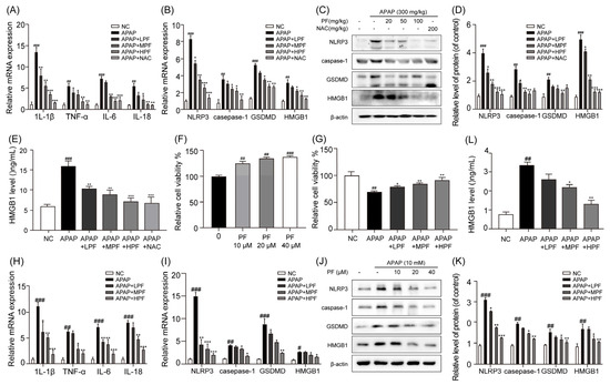 Human hepatoma G2 (HepG2) cells and alpha mouse liver 12 (AML-12) cells are widely used as in vitro models to investigate the mechanisms underlying AILI [29,30]. HepG2 and AML-12 cells were used to further explore the effect of PF on hepatocyte pyroptosis. PF significantly enhanced the cell viability in both HepG2 and AML-12 cells (Figure 2F and Figure S2B). Compared with the NC group, the APAP treatment decreased HepG2 and AML-12 cell viability, which was reversed by PF (Figure 2G and Figure S2C). The mRNA levels of the inflammatory factors IL-1β, TNF-α, IL-6, and IL-18 in both the HepG2 and AML-12 cells were increased by APAP. However, the PF treatment markedly reduced these levels (Figure 2H and Figure S2D). Compared to the APAP group, the PF treatment reduced the mRNA and protein expression levels of NLRP3, caspase-1, and GSDMD (Figure 2I–K and Figure S2E). In addition, we investigate the effects of PF on the NLRP3 inflammasome, one of the upstream activators of pyroptosis. The activation of NLRP3 leads to the activation of caspase-1 and GSDMD, which, in turn, induces pyroptosis [31,32]. Therefore, we speculated that PF acts upstream of inflammasome activation, but the specific pathway requires further investigation. In HepG2 cells, PF effectively inhibited the mRNA and protein levels of HMGB1, both intracellularly and extracellularly, following APAP stimulation (Figure 2I–L). These findings demonstrate that PF can effectively alleviate APAP-induced hepatocyte inflammation and pyroptosis.