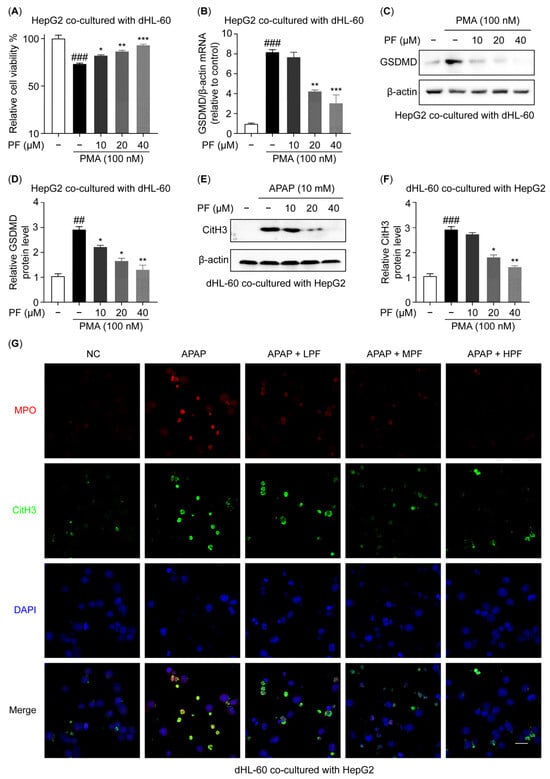 PF intervenes the crosstalk between hepatocyte pyroptosis and NETs. (A) HepG2 cells in the co-culture were treated with PMA (100 nM) for 4 h, followed by treatment with various concentrations of PF (0, 10, 20, and 40 μM) for 24 h; subsequently, cell viability was assessed using the MTT assay (n = 3). (B) The mRNA expression level of GSDMD in the HepG2 cells in the co-culture was quantified using qRT-PCR. (C,D) The protein level of GSDMD in the HepG2 cells in the co-culture was assessed by WB analysis and reported relative to β-actin levels. (E,F) The protein levels of CitH3 in the dHL-60 cells in the co-culture were assessed using WB analysis and are reported relative to β-actin levels. (G) A cellular immunofluorescence analysis was performed to evaluate the expression of MPO and CitH3 in the dHL-60 cells in the co-culture (n = 3). The magnification used was ×400. All experimental data are presented as the mean ± SD. ## p < 0.01 and ### p < 0.001 vs. the NC group; * p < 0.05, ** p < 0.01, and *** p < 0.001 vs. the APAP group or PMA group.