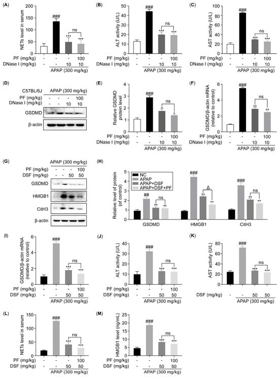 Given that disulfiram (DSF) can inhibit pyroptosis by preventing GSDMD pore formation, we subsequently treated the mice with DSF. As shown in Figure 5G–I, the protein and mRNA expression levels of GSDMD were significantly suppressed by DSF. Compared with the APAP group, the serum ALT and AST levels were significantly lower in the DSF-treated group. The combination of DSF and PF did not lead to further reductions in the ALT and AST levels. Compared with DSF alone, PF combined with DSF reduced the ALT and AST levels from 46.857% and 39.927% to 45.347% and 36.419%, respectively (Figure 5J,K). The results show that PF alleviates the AILI by inhibiting hepatocyte pyroptosis. Compared with the APAP group, when the mice were administered DSF, the levels of HMGB1 in the liver and serum were also significantly reduced (Figure 5G,H,M). Similarly, DSF inhibited CitH3 protein levels in the liver and NETs levels in the serum of the APAP-treated mice. The combination of DSF and PF did not lead to further changes in the levels of CitH3 and NETs (Figure 5G,H,L). These results suggest that PF can interfere with NETs’ formation by inhibiting hepatocyte pyroptosis.