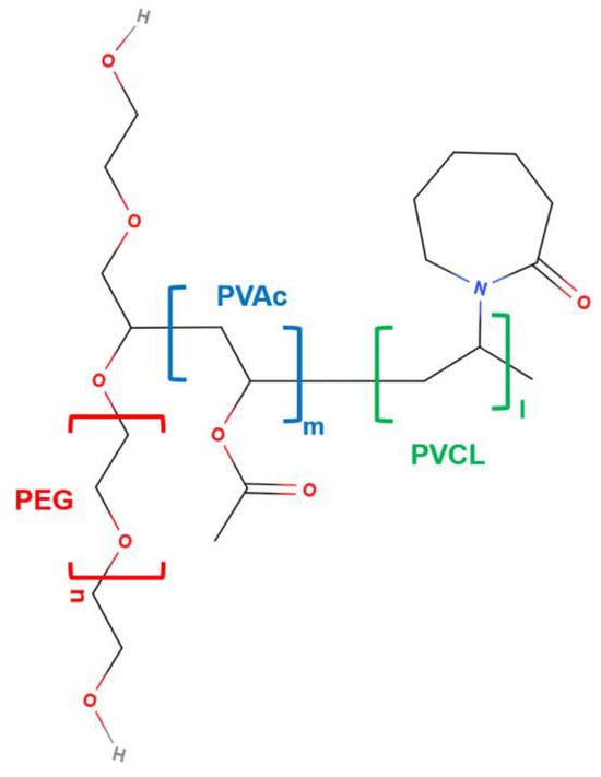 From the structural viewpoint, SLP is an amphiphilic tri-block copolymer (Figure 1). The hydrophilic part of SLP consists of a polyethylene glycol (PEG) block, which represents 13% of the polymer mass, while the lipophilic part is formed by polyvinyl caprolactam, PVCL (57%), and polyvinyl acetate, PVAc (30%), with an average molar mass of 118,000 g/mol []. When used above its critical micelle concentration (CMC, 7.6 mg/L at 23 °C), SLP can form micelles that encapsulate poorly soluble drugs, improving their dissolution and absorption. Below the CMC, it acts as a stabilizing agent, preventing precipitation by inhibiting nucleation and crystal growth and maintaining the drugs in a supersaturated state []. The micelles are relatively large, with typical diameters ranging from 70 to 100 nm at pH 7 [].