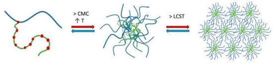 Alopaeus et al. (2019) have reported on the effect of pH, ion content and type on the micellization of SLP [], results that are consistent with the prior findings by Wu et al. (2017) []. They also described that micellization occurs in three stages. First, micelles start forming when both CMC and CMT (critical micelle temperature) are surpassed. Then, as the temperature continues to increase, the PEG chains of SLP dehydrate, clustering below the lower critical solution temperature (LCST). Finally, once the LCST is exceeded, micelles undergo gelation (Figure 2) [,].