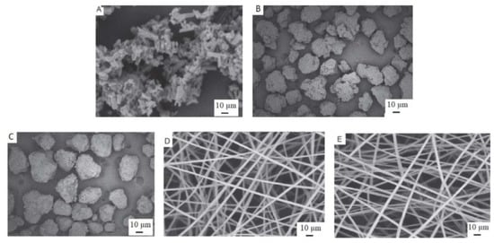 Scanning electron microscope images (A) native efavirenz, (B) SLP as received, (C) physical mixture of efavirenz and SLP, (D) efavirenz-loaded SLP nanofibers, and (E) SLP nanofibers. From Ahmed et al., with permission [].