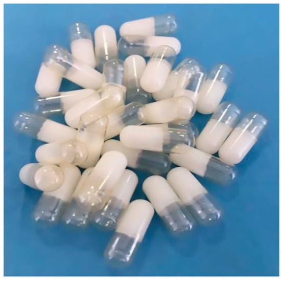 Some recent studies have described the use of SLP for capsule formulations. For instance, Dukhan et al. (2018) investigated formulations of gliclazide, a challenging compound in terms of solubility. They prepared solid dispersions of the drug with SLP in a 1:8 ratio using solvent evaporation. Then, the product was formulated into gelatin capsules, which showed improved dissolution profiles compared with the physical mixture drug–polymer []. The same objective was pursued by Desai et al. (2023), who investigated the use of SLP as a carrier aimed at enhancing the oral delivery of arteether, an antimalarial poorly water-soluble drug, in the form of capsules. The formulation showed enhanced solubility and a stable amorphous state, which allowed improved dissolution rates and bioavailability of the drug by oral administration []. A similar study was conducted by Nazli et al. (2023), in which they utilized SLP as a polymeric precipitation inhibitor in a semi-solid SEDDS for the oral delivery of aprepitant, a poorly soluble drug used for the blockage of nausea and vomiting. The formulation process involved melting SLP along with other excipients, such as Kollidon® VA64 and PVP, by incorporating the drug at different concentrations. The optimized formulation consisted of 100 mg of CapryolTM 90, 500 mg of Kolliphor® CS20, 400 mg of Transcutol® P, 100 mg of SLP, and 40 mg of aprepitant, which was introduced into gelatin capsules for oral administration (Figure 6). This formulation showed improved solubility, dissolution profiles, and bioavailability compared with the pure aprepitant, as well as that the drug released faster from the optimized formulation than the commercial product [].