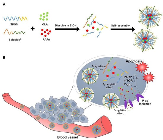 Schematic diagram of (A) micelle preparation of TPGS, SOL, OLA, and RAPA and (B) representation of the behavior of OLA/RAPA-TPGS/SOL in cancer cells (Abbreviations: TPGS, D-α-tocopheryl polyethylene-glycol (PEG) 1000 succinate; SOL, Soluplus®; OLA, olaparib; RAPA, rapamycin; EtOH, ethanol; PARP, poly(ADP-ribose) polymerase; mTOR, mammalian target of rapamycin; P-gp, P-glycoprotein; EPR effect, enhanced permeability and retention). From Shin et al., with permission [].
