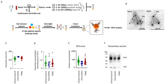 Experimental overview of exosome enrichment and characterization. (A) Schematic representation of exosome isolation from peripheral blood and MACSPlex exosome assay. (B) Transmission Electron Microscopy (TEM) images showing enriched plasma exosomes and exosome marker CD9 from two PDAC patients. (C,D) Measurement of nanoparticle concentration (N/mL plasma) by the nanoparticle tracking analysis (NTA) in controls (n = 36), pancreatitis (n = 16), and PDAC groups (n = 32). (E) Exosomal protein concentration, measured by the BCA assay, in controls (n = 43), pancreatitis (n = 20), and PDAC groups (n = 35). (F) Measurement of protein concentration by Western blot. Data are mean ± s.d.