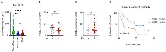 Exo-CD40 showed a significant difference in their relative number between the different sample groups. The expression of CD40 was significantly decreased in PDAC (n = 48, **** p < 0.0001) and pancreatitis (n = 21, *** p < 0.0002) patients in comparison to clinical control individuals (n = 51); however, no difference in the expression of CD40 was observed between pancreatitis and PDAC patients (Figure 2A). The clinicopathological parameters pTNM, perineural invasion, and tumor grading stage are linked to the progression of pancreatic cancer. Therefore, a detailed correlation of exosomal CD40 with different pathological parameters was performed. No difference in the expression of CD40 in PDAC patients was observed with respect to the nodal category (pN0 vs. pN+) (Figure 2B), perineural invasion (Pn0 vs. Pn1) (Figure 2C), tumor category (pT1/2 vs. pT3/4), metastasis (M0 vs. M1), grading (G1/2 vs. G3/4), and neoadjuvant treatment (yes vs. no) (Figure S4A–D). To determine the prognostic relevance of exosomal CD40, PDAC patients were grouped into low (CD40 > median) and high (CD40 < median) to correlate it to overall survival. Table S1 presents the characteristic features of the study population divided based on the median exo-CD40 levels. We found that patients with a lower expression of exo-CD40 had a significantly favorable overall survival rate in comparison to the higher exo-CD40 expression (Figure 2D). As age is one of the important factors during pancreatic cancer, we analyzed whether age of the PDAC, pancreatitis or clinical control patients played a role in the expression of exo-CD40. We did not see any alterations (Figure S4E–G).