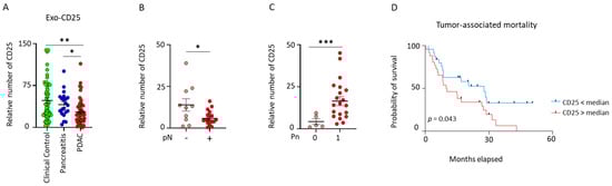 Next, we explored the exo-CD25 expression in clinical control, pancreatitis, and PDAC patients. We found a significant decrease in PDAC patients in comparison to pancreatitis patients (* p < 0.034) and control individuals (** p < 0.001). However, no difference in the expression of CD25 was observed between pancreatitis patients and control individuals (Figure 3A). Next, we analyzed if a different pathological extent influenced the expression of exo-CD25. It indeed influenced the nodal category and perineural invasion status of PDAC patients. PDAC patients with positive nodal category (pN1/pN2) had a significantly lower expression than PDAC patients with negative nodal category (pN0) (Figure 3B). PDAC patients with perineural invasion reflected findings opposite to the nodal category. Here, PDAC patients with perineural invasion (Pn1) status had a significantly higher exo-CD25 expression than PDAC patients without perineural invasion (Pn0) (Figure 3C). No differences were found in other pathological examinations like tumor category (pT1/pT2 vs. pT3/pT4), metastasis, grading and treated (neoadjuvant) against untreated PDAC patients (Figure S5A–D). Further, to determine the influence of exo-CD25 in the survival of PDAC patients, we grouped PDAC patients into low and high groups according to their median expression. PDAC patients with higher exo-CD25 had reduced overall survival when compared to PDAC patients with low exo-CD25 expression (Figure 3D). Characteristic features of the study population dichotomized by the median exosomal CD25 are listed in Table S2. Similar to exo-CD40, age did not influence the expression of exo-CD25 in clinical control, pancreatitis, and PDAC patients (Figure S5E–G).