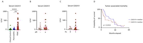 CA19-9 to discriminate PDAC patients from clinical controls and pancreatitis patients. (A) Serum CA19-9 levels in clinical control, pancreatitis, and PDAC patients Mann–Whitney test, ** p = 0.002, **** p = <0.0001. (B,C) Correlations between serum CA19-9 levels with nodal category and perineural invasion status in patients with PDAC. (D) Kaplan–Meier curves displaying survival analysis of patients with PDAC (Gehan–Breslow–Wilcoxon). Data are mean ± s.d.