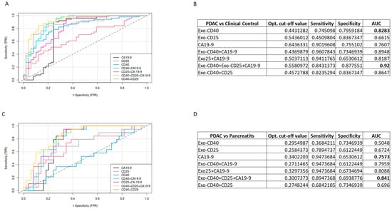 Receiver operating characteristic (ROC) curves analysis of exosome-surface markers and CA19-9. (A) ROC curves discriminating the PDAC group from clinical controls. Each ROC curve shows the single markers exo-CD40, exo-CD25, and CA19-9 and the combination with the highest AUC. (B) Table representing the cut-off values, sensitivity, specificity for exo-CD40, exo-CD25, and CA19-9 surface markers and the selected combination. (C) ROC curves discriminating the PDAC group from pancreatitis. (D) Table representing the cut-off values, sensitivity, specificity for exo-CD40, exo-CD25, and CA19-9 surface markers and the selected combination.