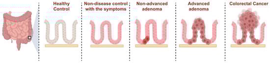 The adenoma–carcinoma sequence in colorectal cancer progression. The adenoma–carcinoma sequence is a model that represents colorectal cancer progression and is a fundamental concept in colorectal cancer research. Colorectal cancer progresses from normal epithelial cells to non-diseased controls, non-advanced adenoma, advanced adenoma, and cancer. Advanced adenomas, which are in the precancerous stage, have high-grade dysplastic lesions. An advanced adenoma is defined when it contains more than 25% of cells in the villous form, larger than 10 mm, or has three or more polyps. In advanced adenomas, the incidence and mortality rates of colorectal cancer are more than double those of normal and non-advanced adenomas. Figures were created using BioRender.com (accessed on 20 August 2023).