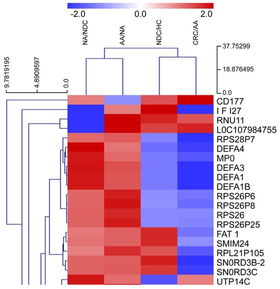 To identify novel circulating transcripts associated with colorectal cancer progression, RNA sequencing was performed on 100 samples (20 from each group: HC, NDC, non-advanced adenoma, advanced adenoma, and colorectal cancer). Of the 46,427 initial genes, 14,844 were analyzed after excluding those with a count value of zero in at least one sample. DEGs between groups were identified using a |log2 fold change| of ≥2 and a p value of < 0.05. A total of 187 significant DEGs were detected across 10 comparison pairs (NDC vs. HC, advanced adenoma vs. non-advanced adenoma, and colorectal cancer vs. advanced adenoma). These DEGs were further examined for their biological significance to the adenoma–carcinoma sequence (Table S1).
