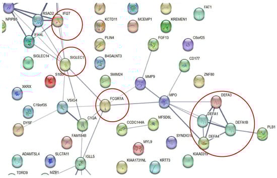 Protein–protein interactions. IFI27, SIGLEC1, FCGR1A, and MPO have connections to DEFAs and CD177, respectively. The protein–protein interaction scores are shown in Table S7. The red circles mean that the networks were able to visually distinguish between the differentially expressed genes(DEGs) related to each stage. IFI27, which showed the highest fold change in the NDG group compared to that in the HC group, was linked to SIGLEC1, which was linked to FCGR1A and MPO. MPO was associated with DEFA4, DEFA3, DEFA1, and DEFA1B, which were highly expressed in the NA group, and with CD177, A representative gene in the CRC group. These results suggest that the mechanism is a sequential reaction that begins with IFI27 and ends with CD177.
