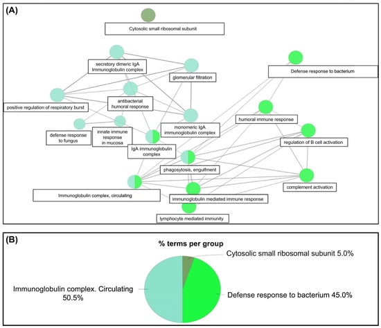 Gene ontology of 187 DEGs during the ACS of CRC in ClueGO. (A) The 187 circulating transcripts expressed during the ACS of colorectal cancer are genes corresponding to a circulating immunoglobulin complex, a defense response to a bacterium, and a cytosolic small ribosomal subunit. (B) The gene ontology terms are circulating immunoglobulin complex (50%), defense response to a bacterium (45%), and cytosolic small ribosomal subunit (5%). DEGs: Differentially expressed genes; ACS: Adenoma–carcinoma sequence; CRC: Colorectal cancer. The associated gene ontology terms are shown in Table S8.