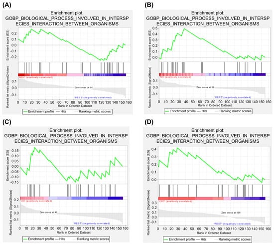 Gene enrichment analysis of biological processes involved in interspecies interactions between organisms. (A) When comparing the DEGs of the NDC group with those of the remaining groups (HC, NA, AA, and CRC), IFI27 was shown to be the most important and significant circulating RNA. (B) When comparing the DEGs of the NA group with those of the remaining groups (HC, NDC, AA, and CRC), DEFA4 was shown to be the most important and significant circulating RNA. (C) When comparing the DEGs of the AA group with those of the remaining groups (HC, NDC, NA, and CRC), MPO was shown to be the most important and significant circulating RNA. (D) When comparing the DEGs of the CRC group with those of the remaining groups (HC, NDC, NA, and AA), CD177 was shown to be the most important and significant circulating RNA. The genes correlated with GSEA analysis in the comparison group are shown in Table S9.