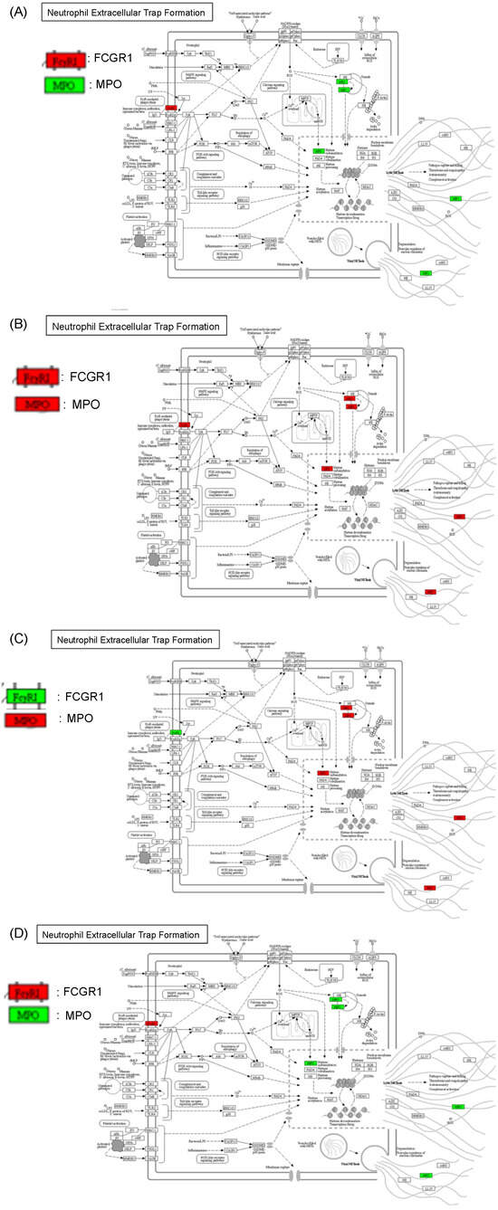 Fold change pattern of proteins in the neutrophil extracellular trap formation with KEGG pathway map viewer. (A) The fold change pattern of circulating transcripts reflects the transition of proteins. The transition pattern of FCGR1 and MPO during the transition from the HC group to the NDC group in the neutrophil extracellular trap formation pathway. Compared to the HC group, the NDC group showed a pattern in which FCGR1 in the cell membrane of neutrophils was upregulated, and MPO in the neutrophil granule was down-regulated. Red: FCGR1; green: MPO. (B) The activation pattern of FCGR1 and MPO during the transition from the NDC group to the NA group in the neutrophil extracellular trap formation pathway. Compared to the NDC group, the NA group showed a pattern in which FCGR1 in the cell membrane of neutrophils was upregulated, and MPO in the neutrophil granule was upregulated. Red: FCGR1; red: MPO. (C) The activation pattern of FCGR1 and MPO during the transition from the NA group to the AA group in the neutrophil extracellular trap formation pathway. Compared to the NA group, the AA group showed a pattern in which FCGR1 in the cell membrane of neutrophils was down-regulated, and MPO in the neutrophil granule was upregulated. Green: FCGR1; red: MPO. (D) The activation pattern of FCGR1A and MPO converting from the AA group to the CRC group in the neutrophil extracellular trap formation pathway. Compared to the AA group, the CRC group showed a pattern in which FCGR1 in the cell membrane of neutrophils was upregulated, and MPO in the neutrophil granule was down-regulated. Red: FCGR1; green: MPO.