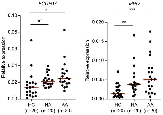 The results of RT-qPCR for FCGR1A and MPO expression of clinical samples. MPO was upregulated in both the NA group and AA group compared to the HC group, and they were statistically significant. FCGR was slightly upregulated in the NA group compared to the HC group, but there was no statistical significance. In the AA group, FCGR1A was upregulated and had statistical significance compared to the HC group. p (*, **, and ***, indicate p < 0.05, p < 0.01, and p < 0.001, respectively, ns means no statistically significance) was calculated by a two-tailed Student’s test. The information on the primers and probes for FCGR1 and MPO are shown in Table S10. Red line: Mean of relative expression.
