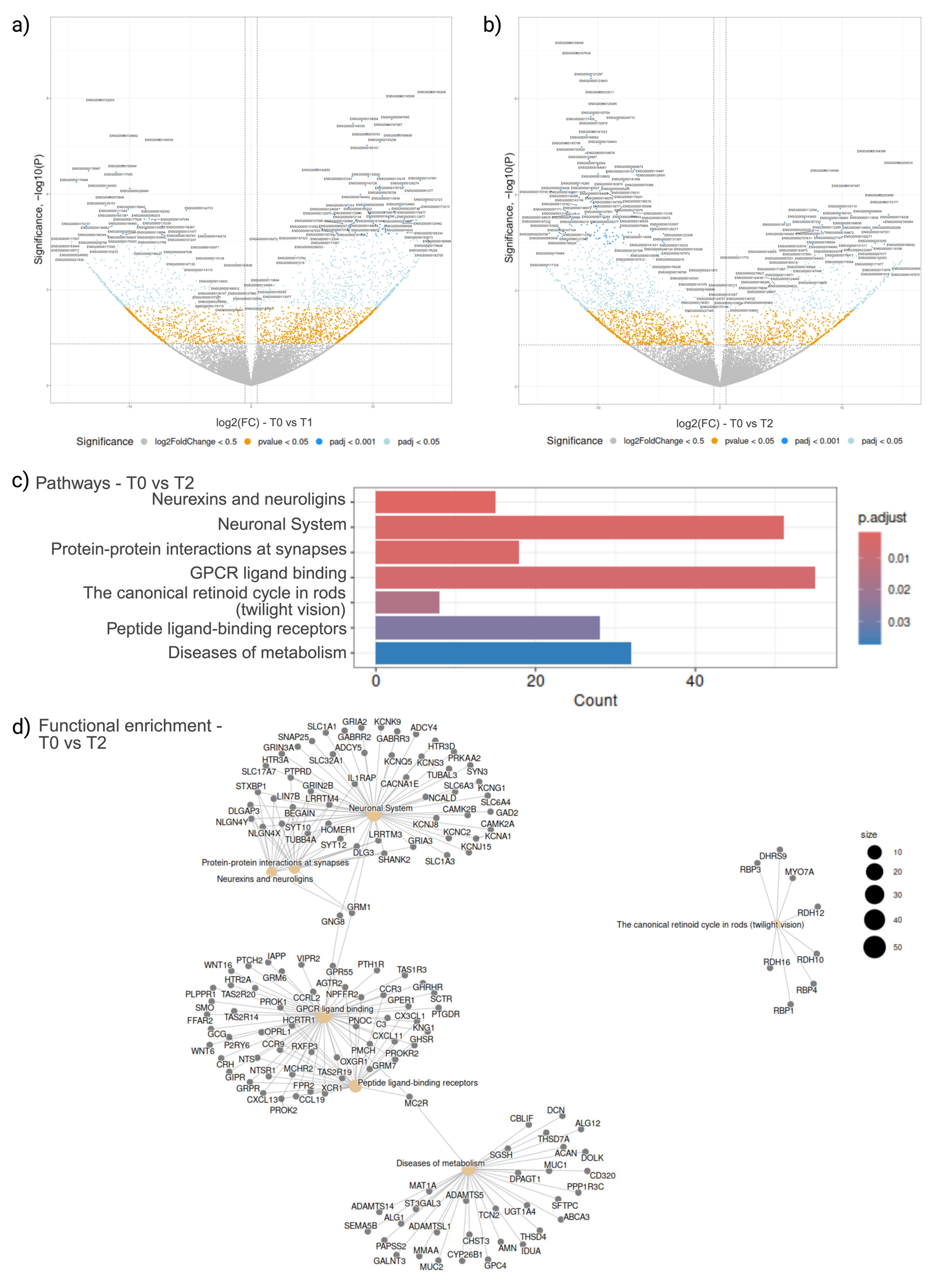 Differential gene expression analysis of cell-free transcriptomics. Volcano plot of DEGs at T1 (a) and T2 (b), when compared to intake sample at T0, identified with p-value < 0.05 and fold change of 1.5 in either direction. Grey: Not significant or under a log2(FC) < 0.5; Yellow: p-value < 0.05; Cyan: False discovery rate adjusted p-value < 0.05; Blue: False discovery rate adjusted p-value < 0.001; (c) Bar plot of the significant pathways in when T2 was compared to T0, ranked according to significance; (d) Functional enrichment visualisation of pathways found when T2 was compared to T0.