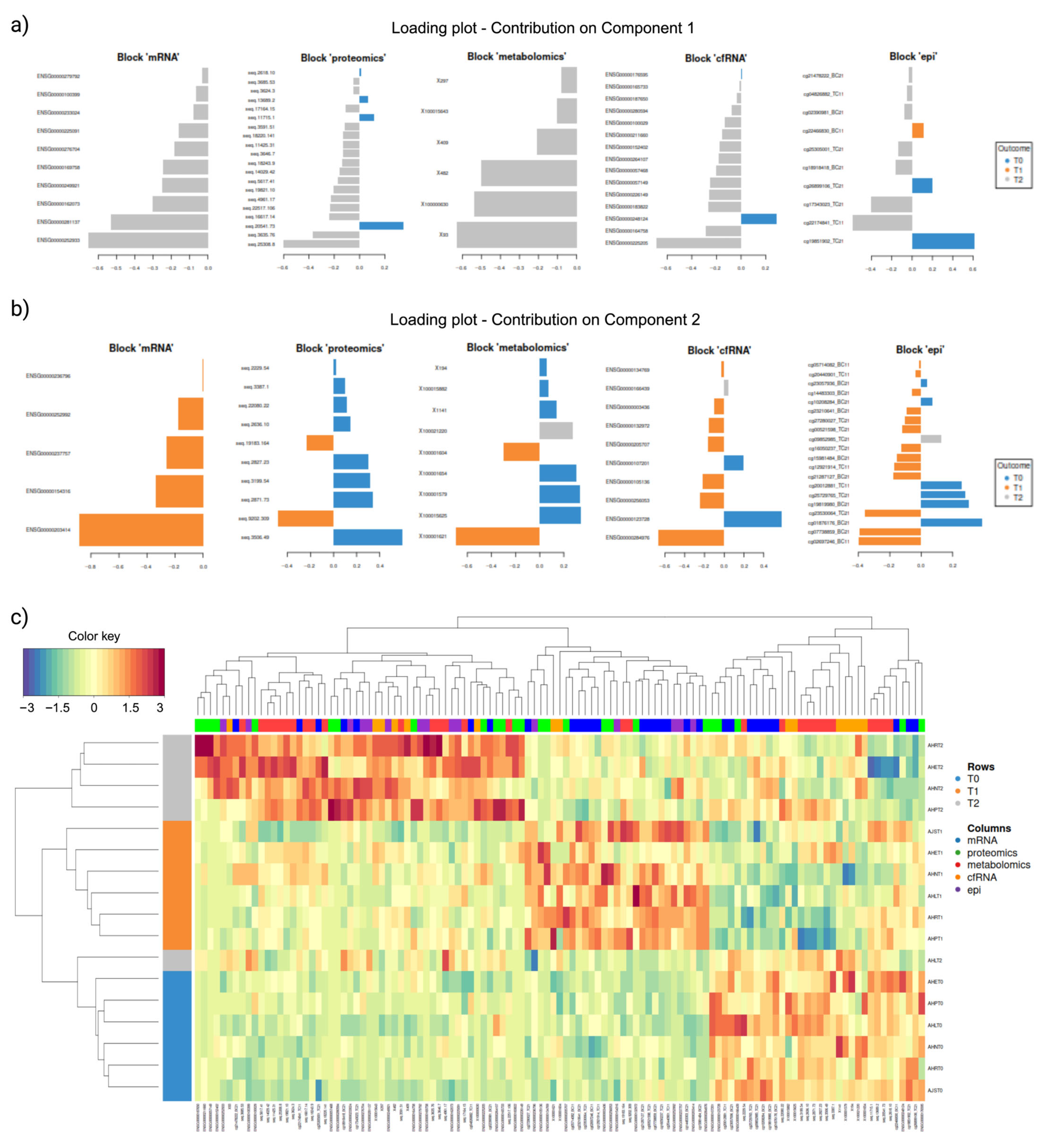 (a) Loading plot of DIABLO selected discriminant features on component one; (b) Loading plot of DIABLO selected discriminant features on component two. For a and b, from left to right, the loading plot shows the most variable molecular features (y-axis) across time points in mRNA, proteomics, metabolomics, cfRNA, and epigenetics datasets, with the length of the bar representing the contribution weight; (c) Hierarchically clustered image map for DIABLO-selected variables, where the rows represent the time points, T0 (blue), T1 (orange), and T2 (grey), and the columns represent the dataset the selected feature belongs to cellular mRNA (blue), proteomics (green), metabolomics (red), cfRNA (orange), and epigenetics (purple).