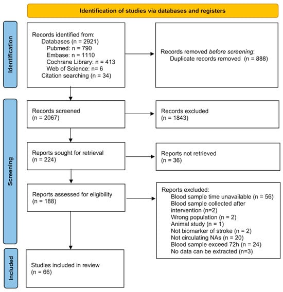 The current research gaps are: (a) CfNAs possess significant potential for IS diagnosis; however, there is no existing systematic review that has compiled the relevant evidence; (b) previous systematic reviews mostly focused on stroke biomarkers within 24 h of symptom onset [,]. Given the future possibility of extending the reperfusion time window to 72 h, there is a need to identify promising cfNAs that cover such an extended time window. In this systematic review and meta-analysis, we aimed to summarize and assess the diagnostic performance of cfNAs in blood for early diagnosis of AIS within 72 h of symptom onset.
