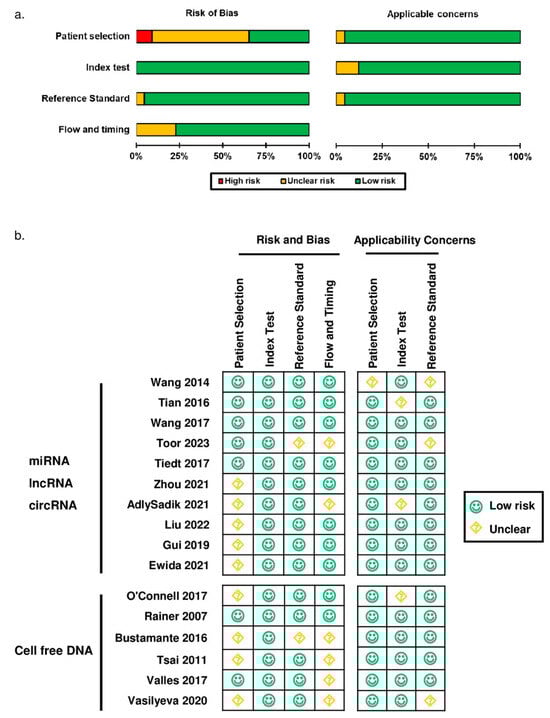 Quality assessment results using QUADAS-2 []. (a) Quality of all included studies; (b) high-quality cfRNA studies and all papers for cfDNA. Wang 2014 [], Tian 2016 [], Wang 2017 [], Toor 2023 [], Tiedt 2017 [], Zhou 2021 [], AdlySadik 2021 [], Liu 2022 [], Gui 2019 [], Ewida 2021 [], O’Connell 2017 [], Rainer 2007 [], Bustamante 2016 [], Tsai 2011 [], Valles 2017 [], Vasilyeva 2020 [].