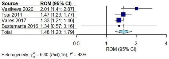 Blood ratios of cfDNA concentrations between ischemic stroke patients and controls. Individual study ratios and their corresponding 95% CIs are indicated by filled squares. The size of the square indicates the weight of the study. The pooled ratio and 95% CI are indicated by a diamond. The dotted line indicates a ratio of one. Ratio of mean (ROM). Vasilyeva 2020 [], Tsai 2011 [], Valles 2017 [], Bustamante 2016 [].