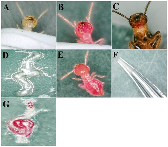 Staining position and sampling from termite worker. (A) Worker oral fluid. (B) Third instar worker-stained oral fluid. (C) Primitive queen oral fluid. (D) Termite gut. (E) Third instar worker that has eaten stained food. (F) Schematic diagram of test tube sucking up oral fluid. (G) Intestines of termites that have eaten colored foodstuffs.
