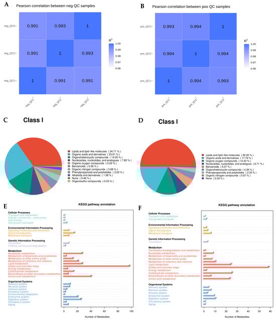 Metabolomic results. (A) Positive ion mode metabolite QC values. (B) Negative ion mode metabolite QC values. (C) Positive ion mode metabolite pie chart. (D) Negative ion mode metabolite pie chart. (E) Positive ion mode metabolite KEGG annotation map. (F) Negative ion mode metabolite KEGG annotation map.
