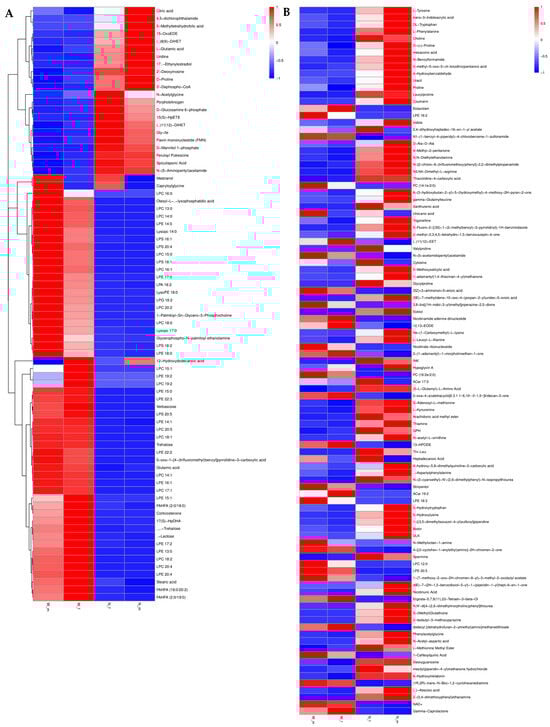 Different metabolites of different castes of termite R. labralis. (A) Difference in negative ion pattern metabolites of different castes of R. labralis. (B) Difference in positive ion pattern metabolites of different castes of R. labralis. The redder the color, the higher the content. See the Supplementary Materials for details.