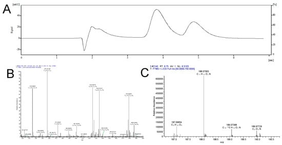 Fish assays. (A) MS and MS/MS spectra of the screened compounds. (B) Thermo Fisher Scientific database matching results. (C) Thermo Fisher Scientific database matching results.