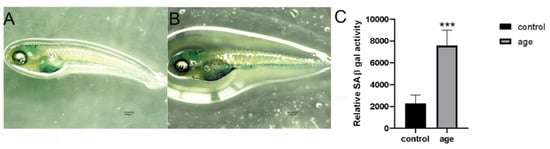 SA-β-gal staining after senescence modeling. (A) Control zebrafish SA-β-gal staining results. (B) Staining results of the premature aging model. (C) Histogram of staining levels of SA-β-gal in control and laboratory groups. Data are means ± SEM; *** p < 0.001. Scale bar = 200 μm.
