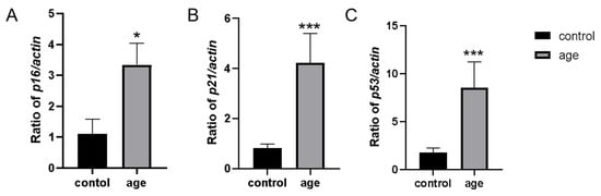 mRNA expression of senescence marker genes p16, p21, and p53. (A) Changes in zebrafish p16 gene expression before and after modeling. (B) Changes in zebrafish p21 gene expression before and after modeling. (C) Changes in zebrafish p53 gene expression before and after modeling. Data are means ± SEM; * p < 0.05; *** p < 0.001.